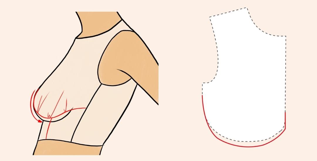 Mesure la valeur qu’il te manque pour que le tissu passe bien sous le sein. Et ajoute au bas de ta pièce bonnet 🙂